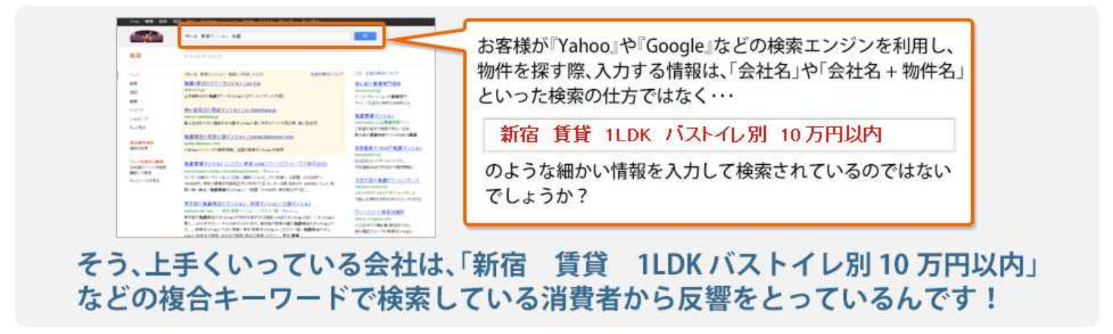 結論からいうと、実際の反響につながっているのは、①会社名、②物件名、③単語以上の複合キーワード、による検索なんです。