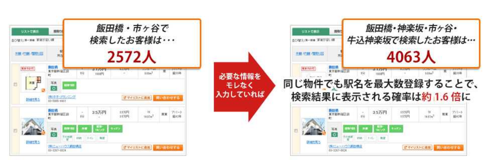 例えば、「飯田橋駅」で検索したお客様は、近くに「神楽坂駅」もあるのにポータルサイトの情報登録を怠ったばっかりにサイト上に表示されず、せっかくのお客様を逃してしまいます。