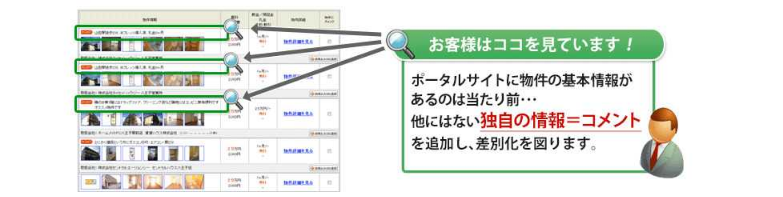 インターネットが普及した今、単なる物件情報は、消費者にとってもはや価値はゼロに等しい時代です。コメント、設備・特記事項、写真などの付加価値・情報こそが唯一消費者が価値を認める情報です。