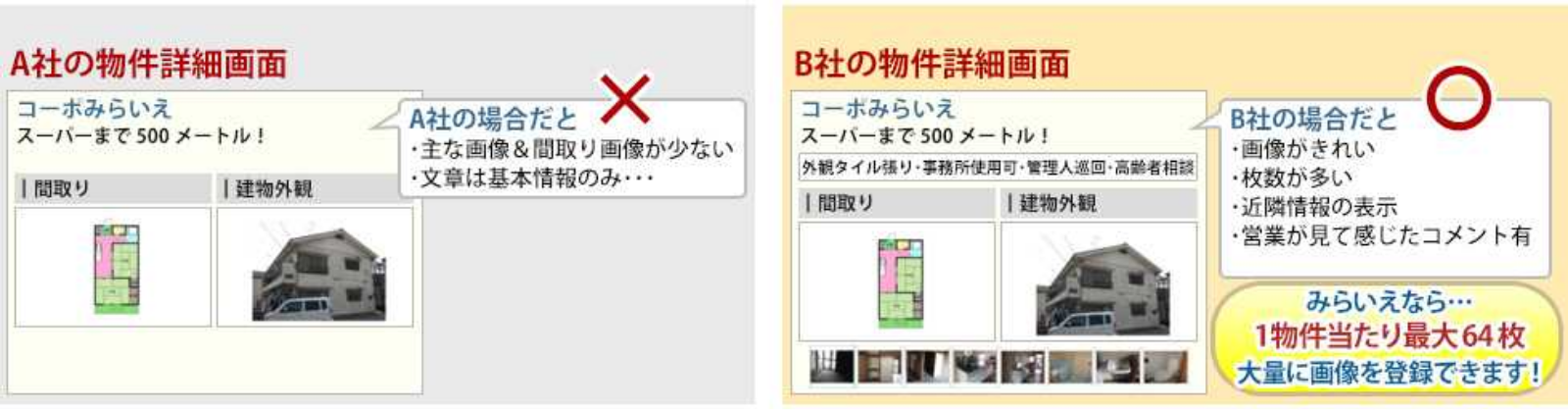 これらの付加価値・情報は、今後の御社の資産(他社との差別化要因)になるもので、資産を形成していくという心構えが必要です。物件は1回決まったらおしまいではありません、また空き室になれば、登録されたこれらの付加価値情報は他社との差別化を決定づけ、何度でも利用できる資産になるのです。